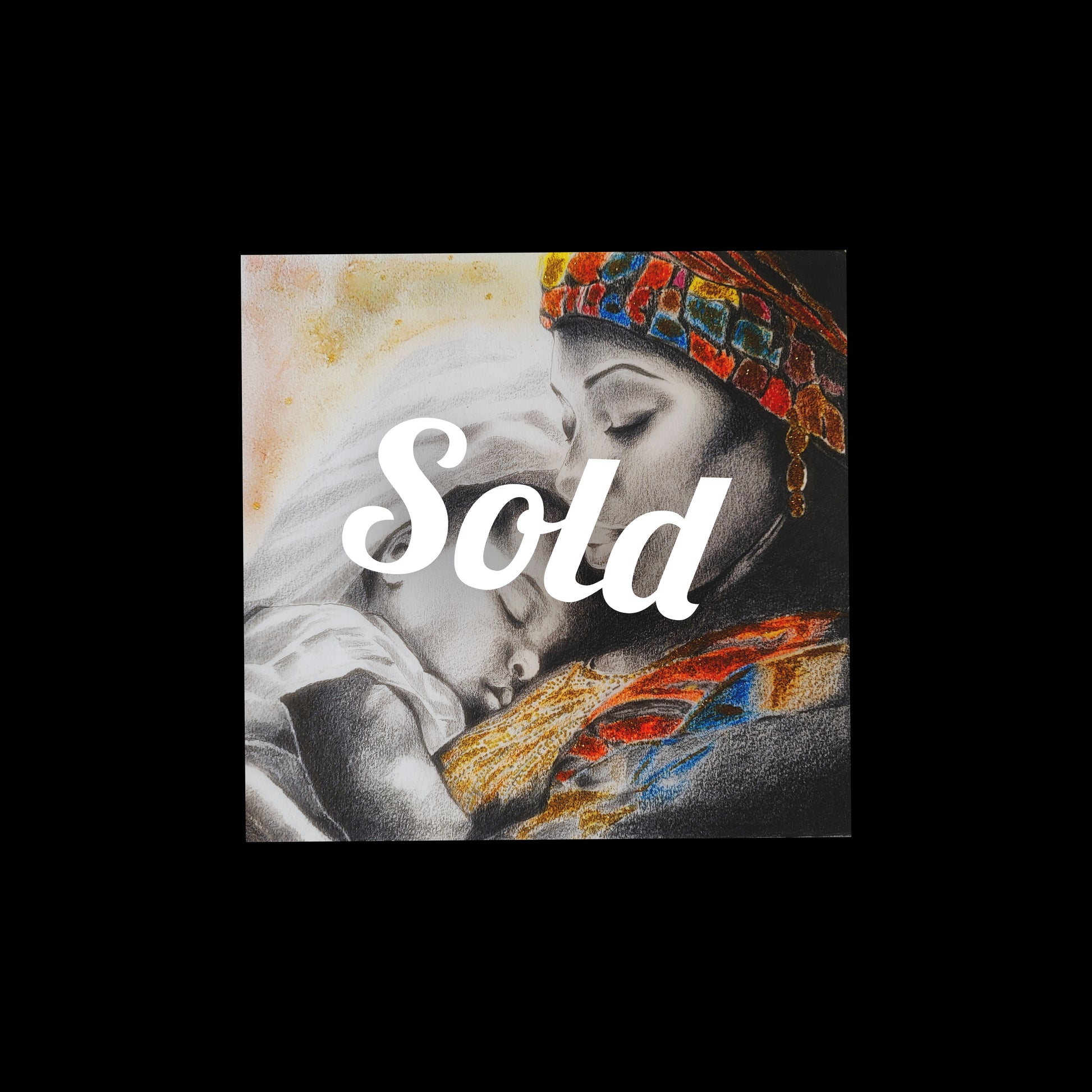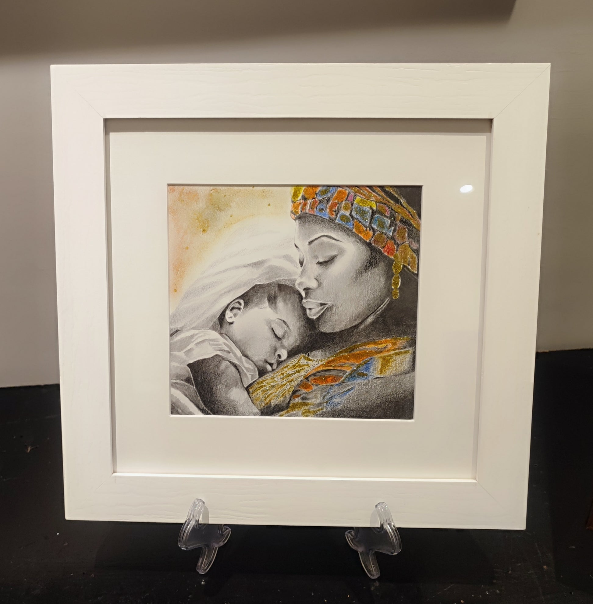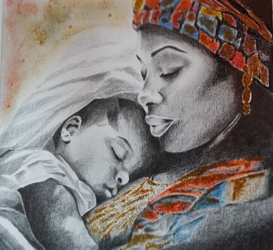 Ritratto a matita, polvere di grafite, matite colorate acquerellabili e glitter per quest' opera creata per l'esposizione collettiva Mama Afrika alla Galleria dei Miracoli in Via del Corso a Roma.