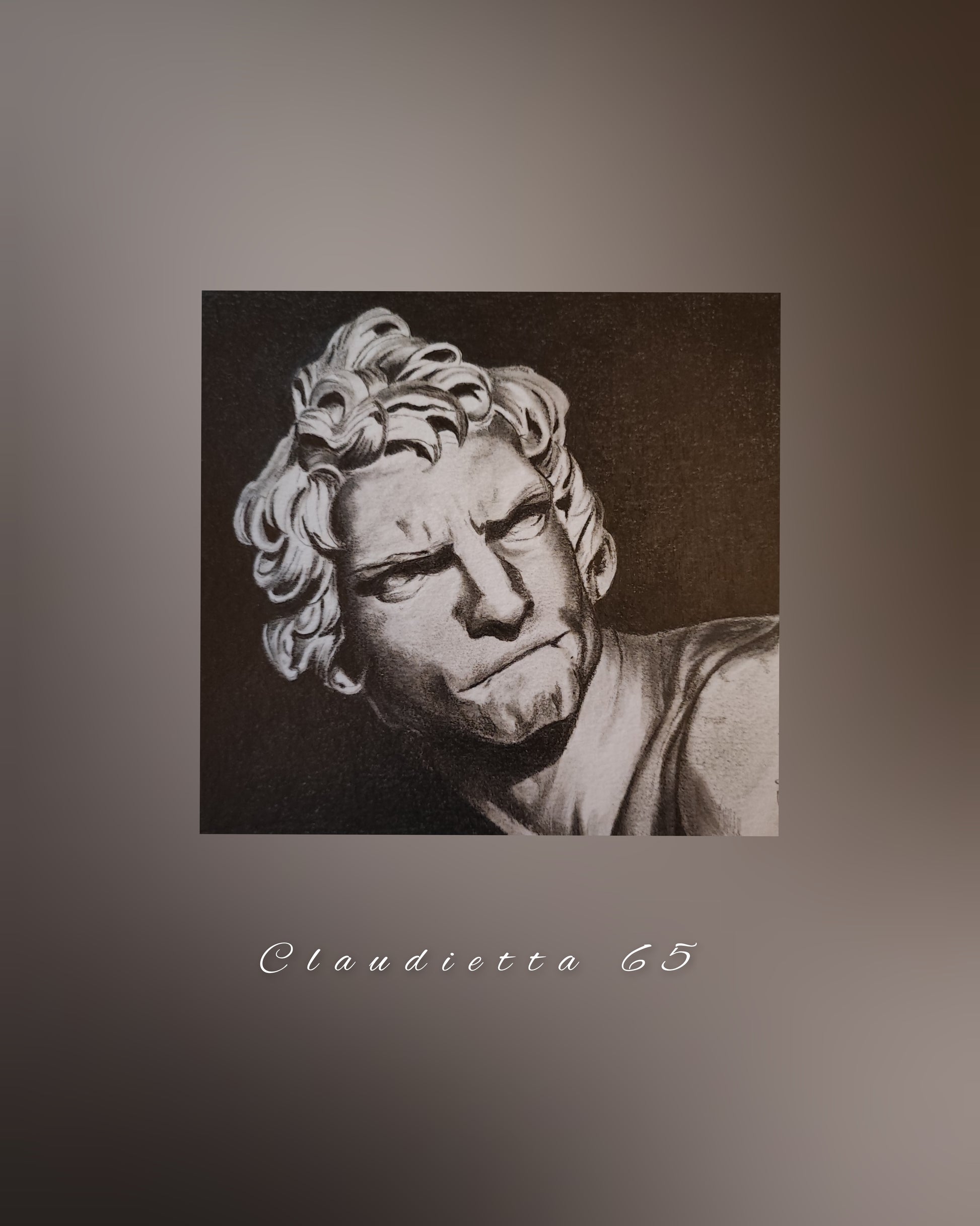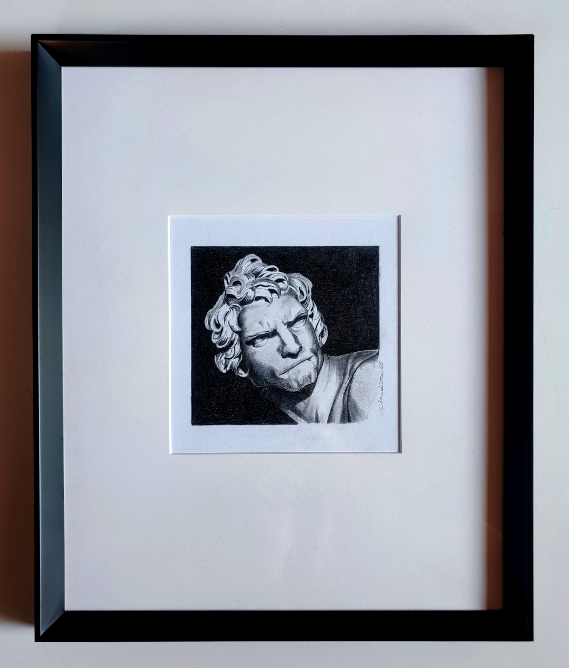 Riproduzione a matita e polvere di grafite su carta ruvida della maestosa statua del David di Bernini, databile 1623/1624 e conservata alla Galleria Borghese di Roma.