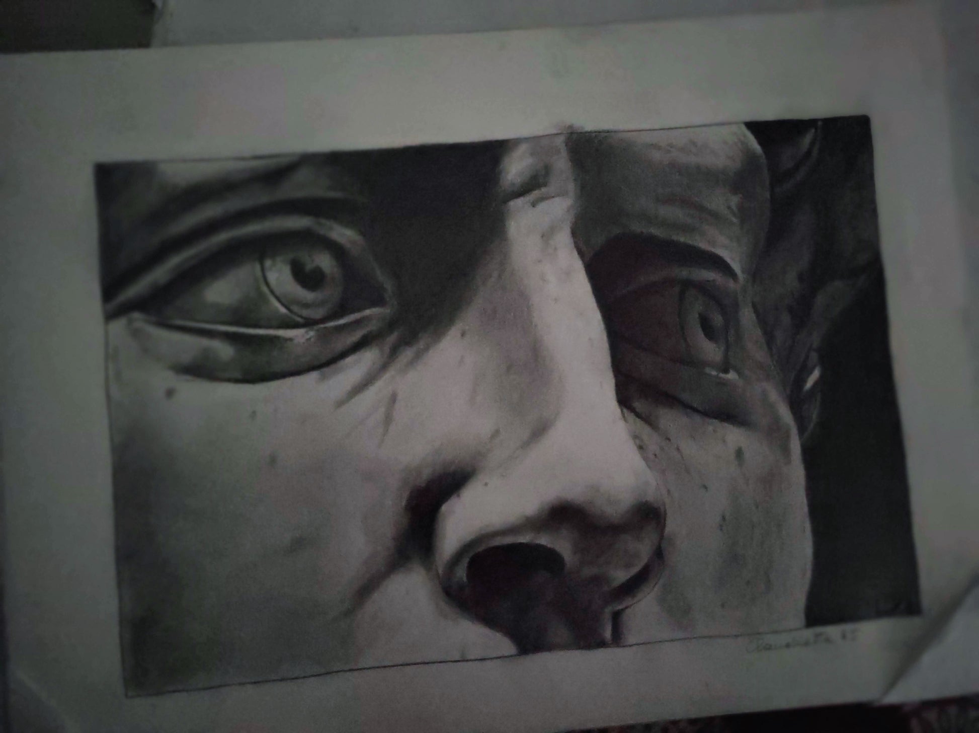 Riproduzione a matita su carta ruvida di un particolare della celebre statua del David di Michelangelo con cornice artigianale argentata leggermente invecchiata. Cornice a vetro