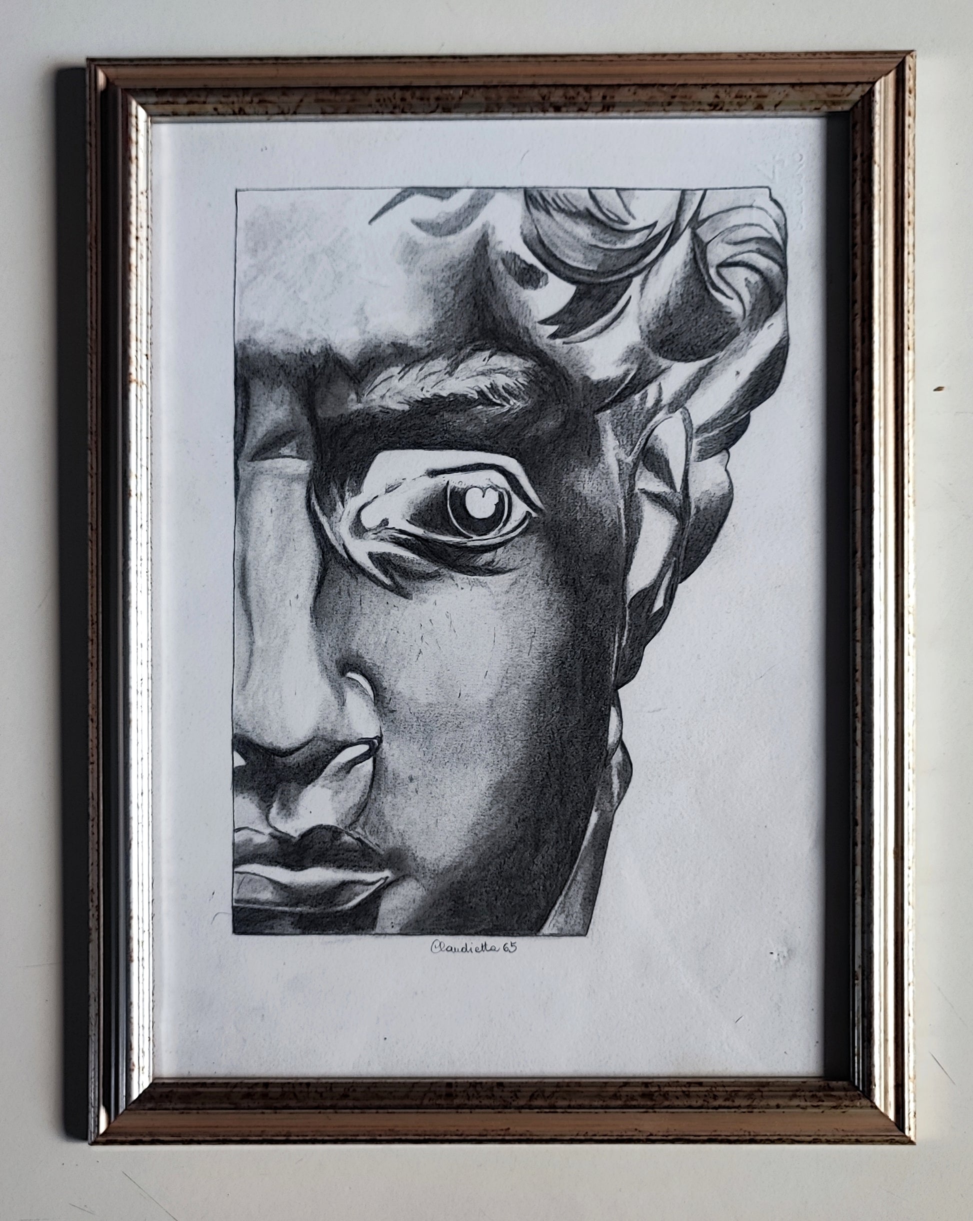 Riproduzione a matita su carta ruvida di questo capolavoro della scultura mondiale. Il David di Michelangelo è l' emblema del Rinascimento, simbolo di Firenze. In questo disegno un particolare del volto riprodotto come se fosse una fotografia al negativo.