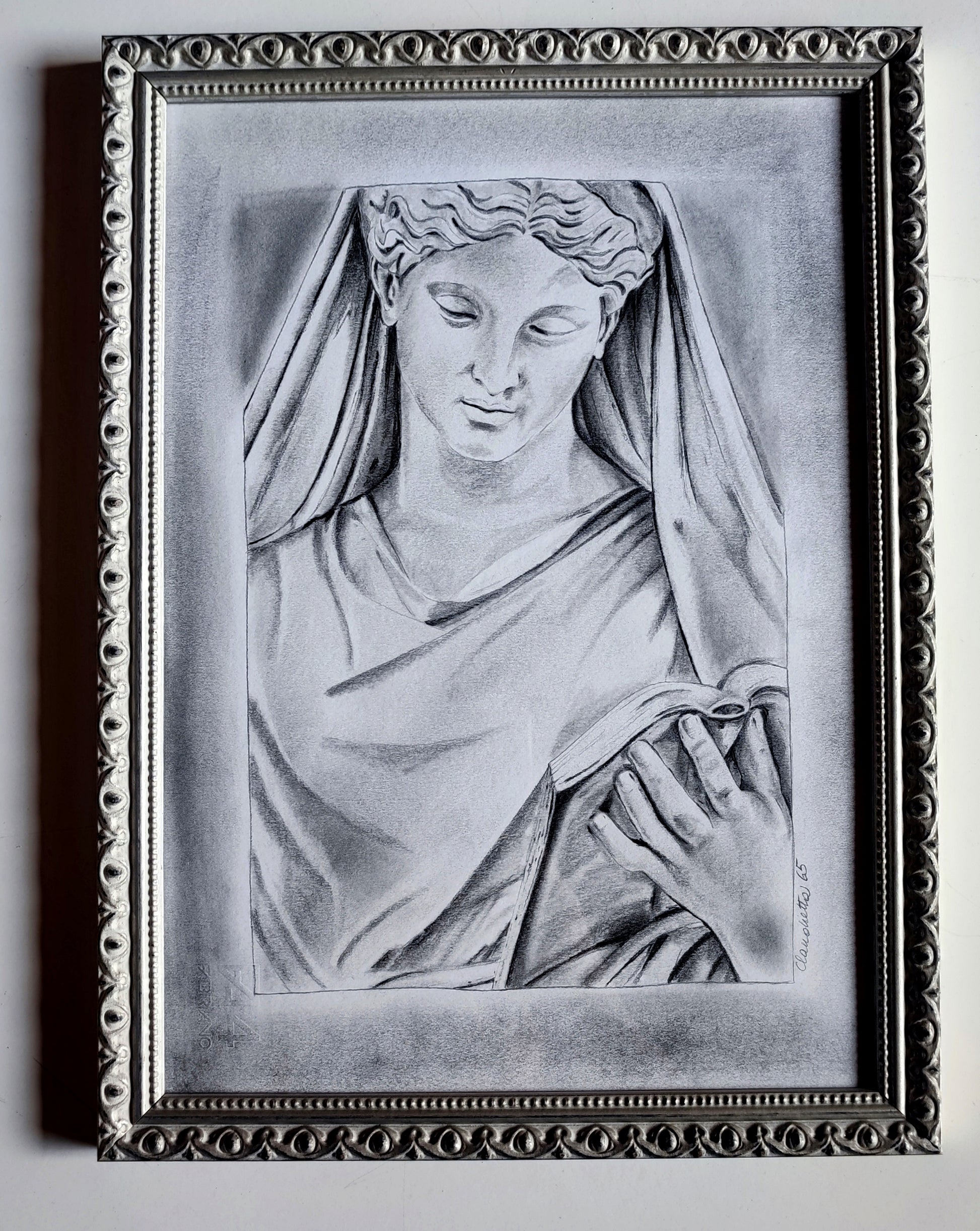 Riproduzione a matita e polvere di grafite su carta ruvida per questa bellissima e grandissima statua situata nel Parco cittadino del centro storico a Potsdam, cittadina appena fuori Berlino in Germania.
