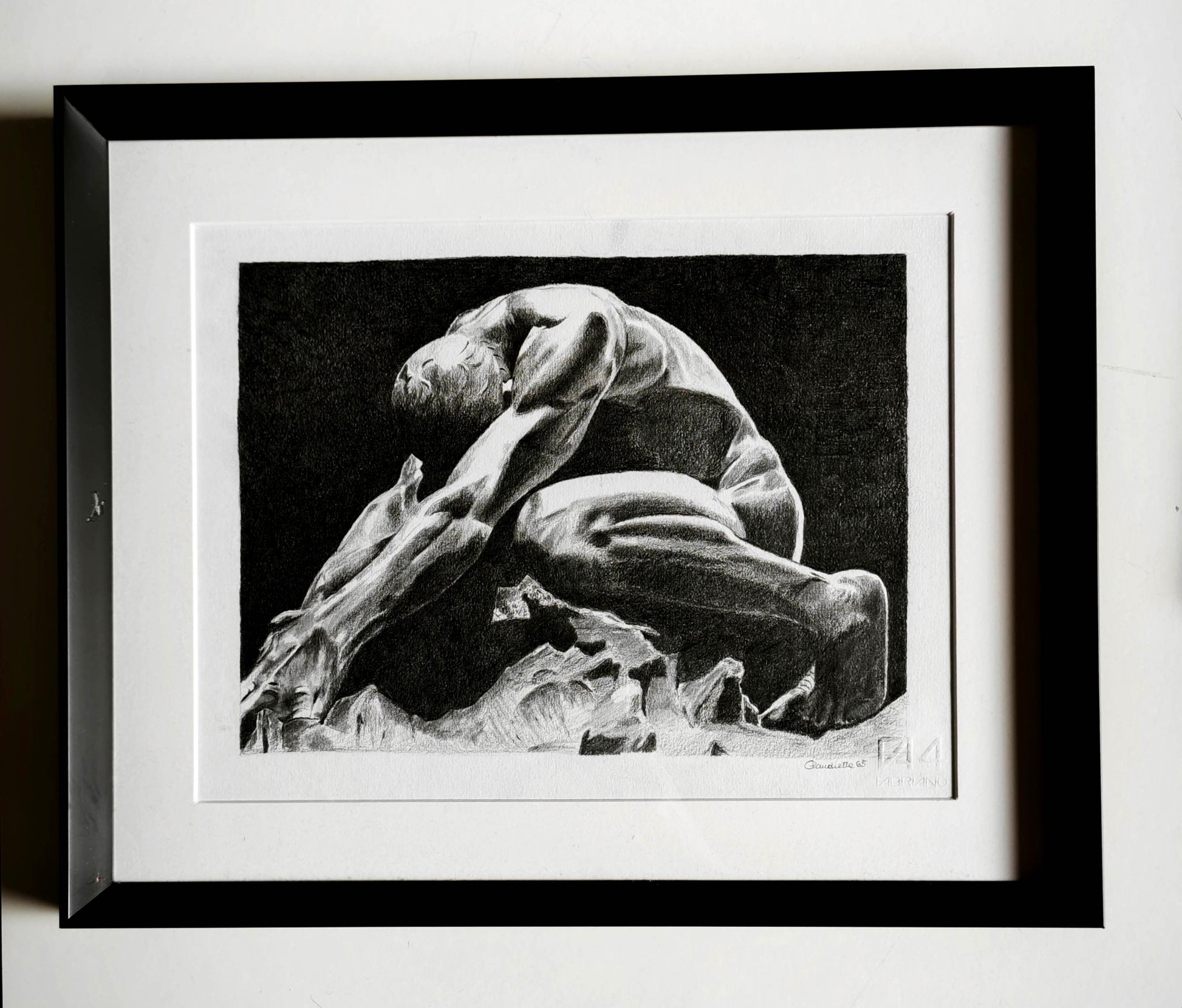 Opera realizzata a matita, carboncino e polvere di grafite su cartoncino ruvido.