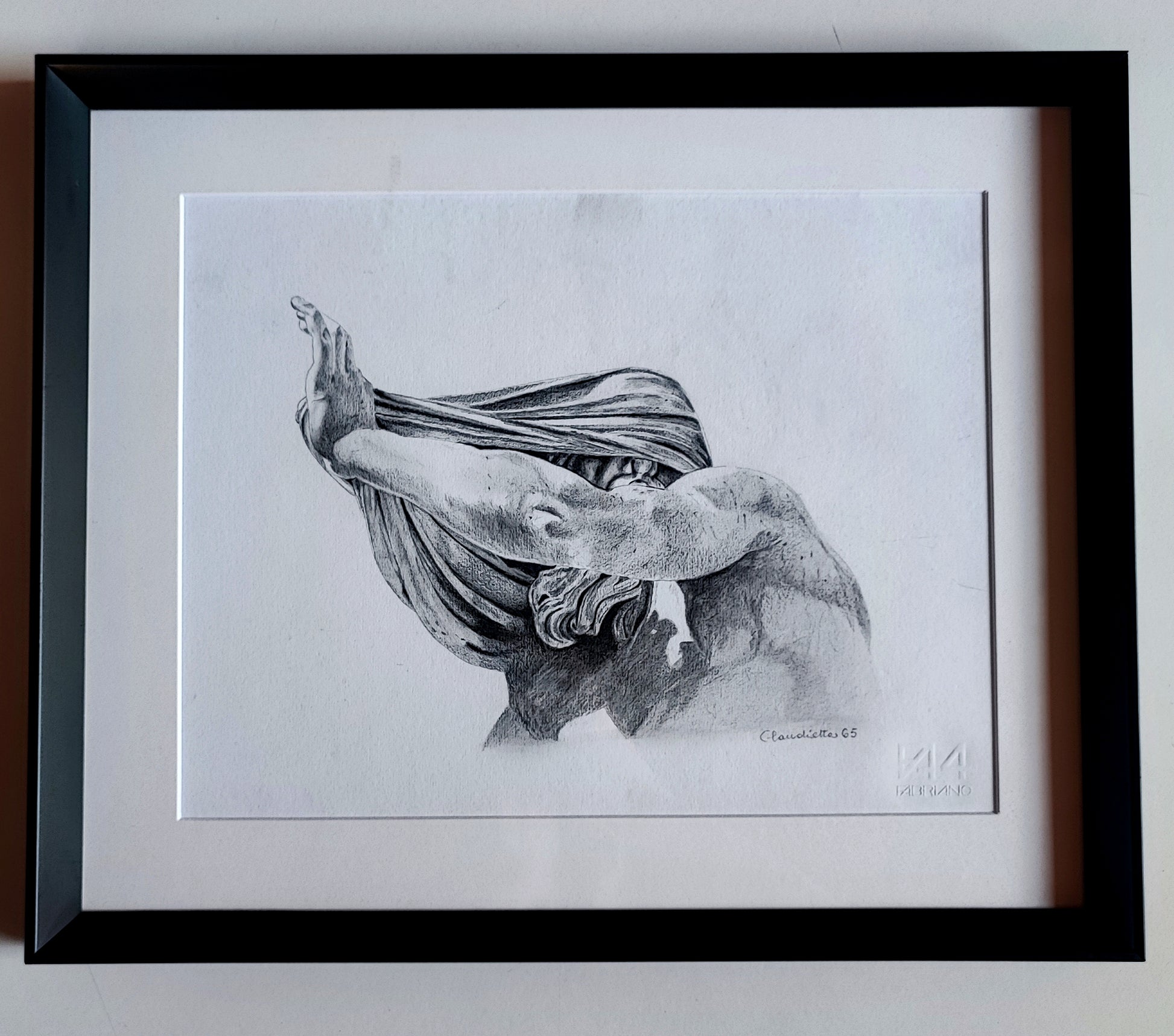 Riproduzione a matita e polvere di grafite su carta ruvida di un particolare del celebre complesso scultoreo della Fontana dei Quattro Fiumi a Piazza Navona a Roma. Databile 1650 ad opera di Giacomo Antonio Fancelli su progetto del Bernini.