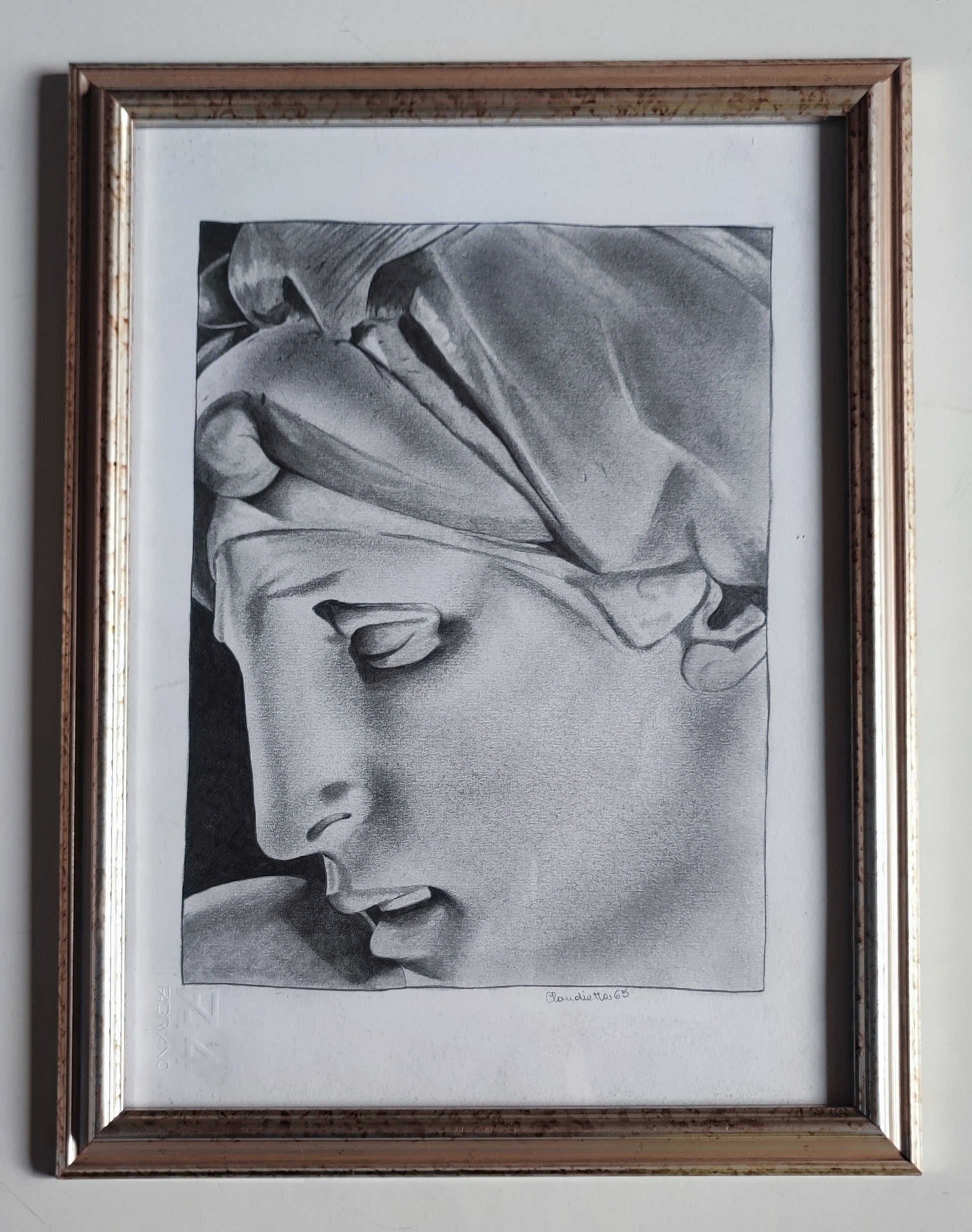 Riproduzione a matita su carta ruvida di un particolare del complesso scultoreo in marmo di Michelangelo Buonarroti databile 1524/1534 situato nella sagrestia nuova in San Lorenzo a Firenze.