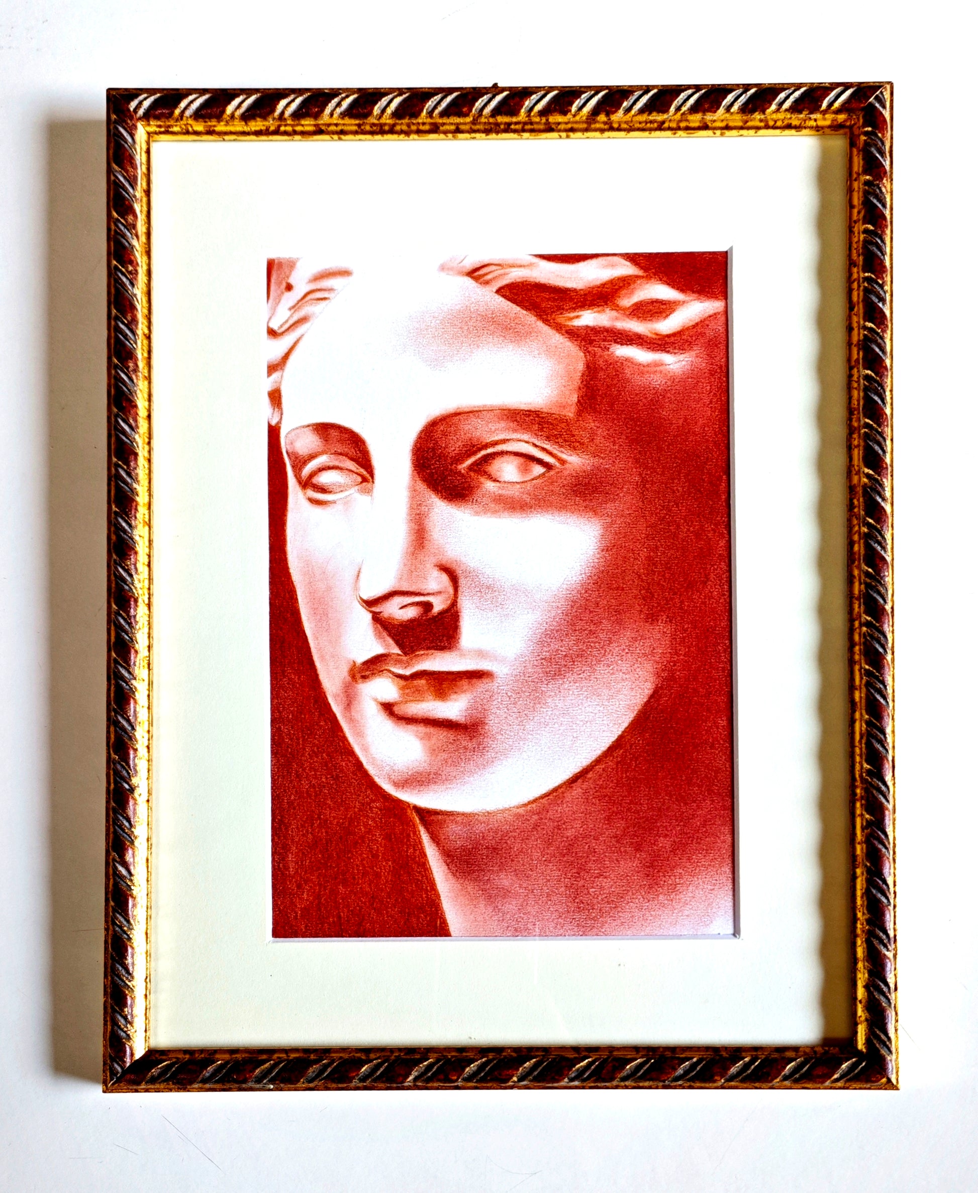 Cornice artigianale in legno interamente intagliata a mano e decorata con ottone e pittura rosa/rossa per richiamare il colore della sanguigna. Passpartout color crema.Cornice a vetro
